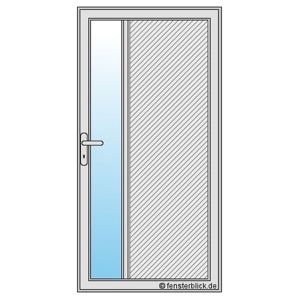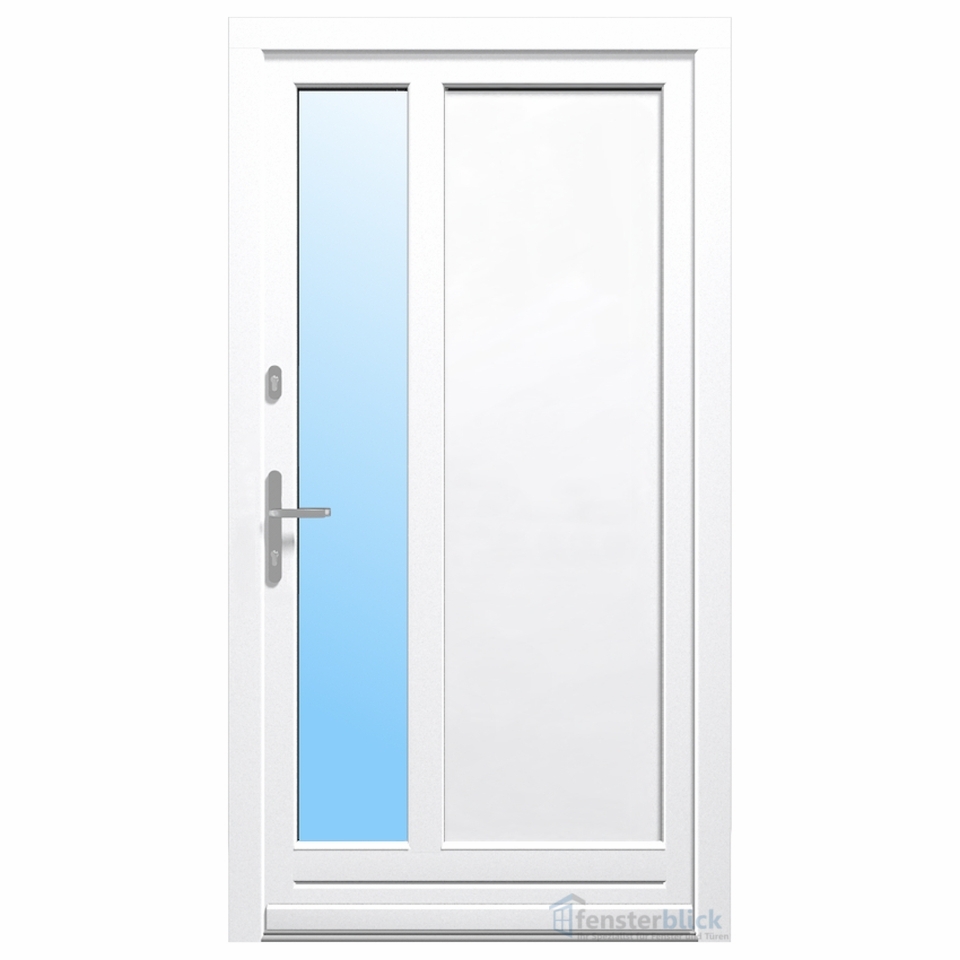 Das Türmodell Eberswalde besteht aus einer schmalen langen Glasfläche auf der einen Seite und einer breiteren Paneelfläche auf der anderen Seite. Durch die ungleiche Teilung entsteht eine spannende Optik. Dies ergänzt sich perfekt mit einem Seitenteil, erzeugt aber auch alleine eine lockere Raumatmosphäre, welche durch die Kämpfersprosse unterstrichen wird. Durch die große Auswahl an Farben und Dekoren lässt sich die optische Gestaltung weiter anpassen. Ein schicker Türgriff rundet das Erscheinungsbild ab. Hier liegt auch die andere Stärke der Nebeneingangstür Eberswalde: Sicherheit. Das hochqualitative Profil und hochwertige Verriegelungssystem bieten einen Einbruchschutz, welcher sich nach Bedarf durch den Einsatz von VSG-Verglasungen oder zusätzlichen Schlössern weiter verbessern lässt. Alle Varianten mit den wichtigsten Information und Preisen finden Sie in unserem Nebeneingangstüren-Konfigurator.