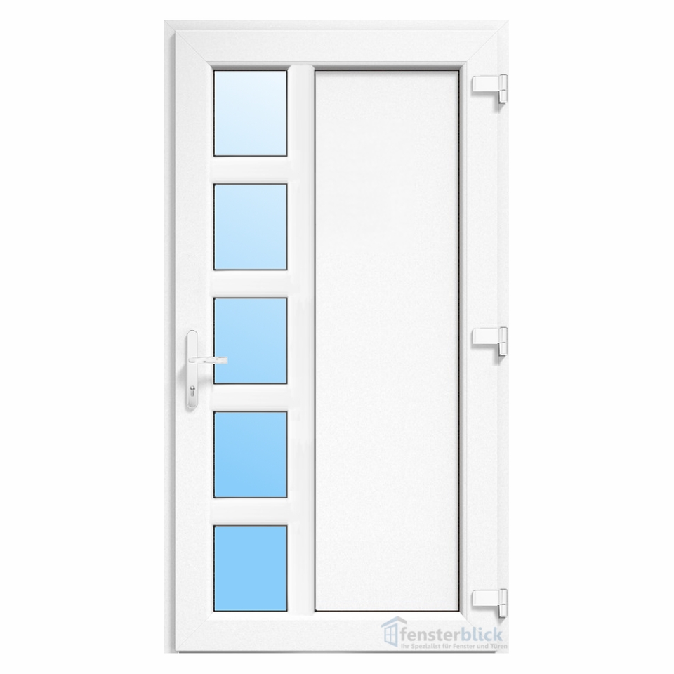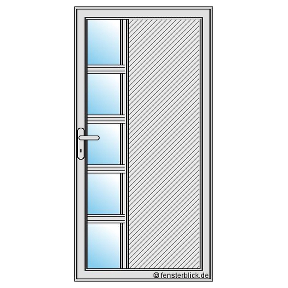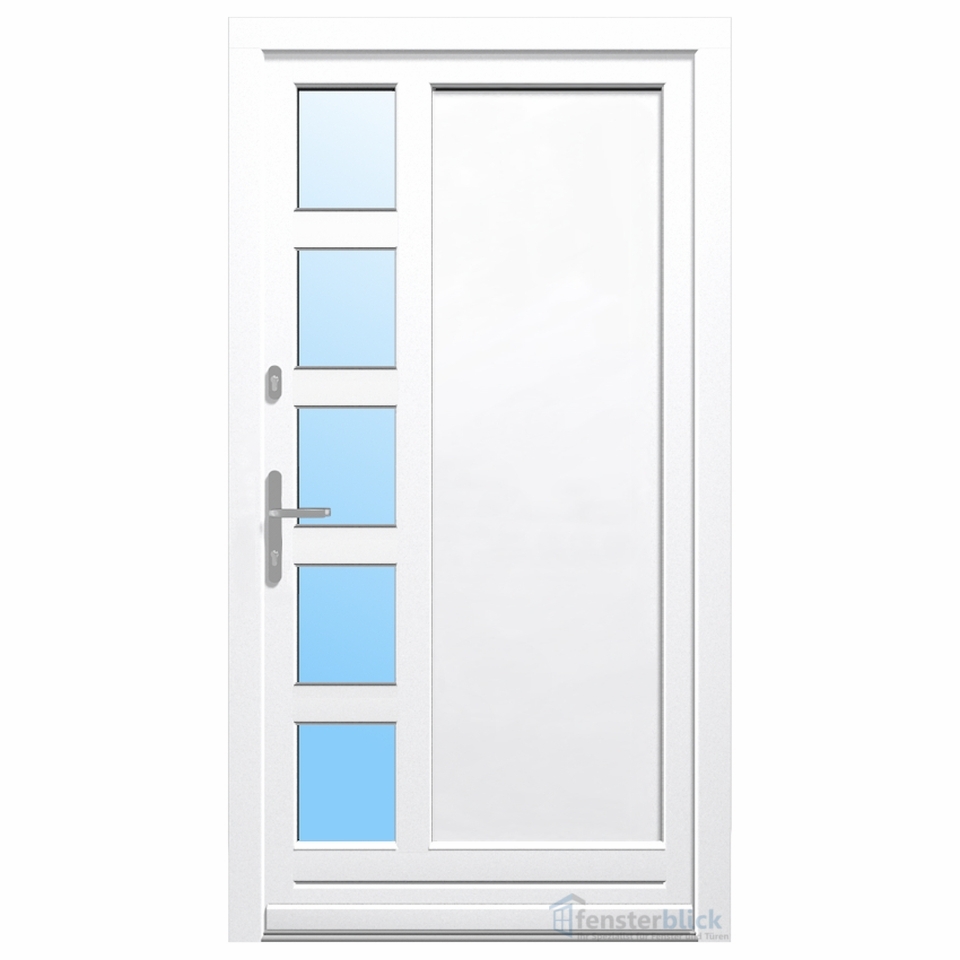 Das auffallende Design der Nebeneingangstür Velten wird Ihre Gäste verzaubern! Die seitliche Glasfläche mit Querkämpfern hat eine ähnlich offene und einladende Wirkung wie ein Seitenteil und lässt sich mit vielfältigen und stilvollen Ornamentgläsern versehen. Gleichzeitig sorgen die fünf gleichgroßen Glasflächen für genügend Tageslichteinfall im Hausinneren. Auch bei der Farbe gibt es viel Spielraum für individuelle Gestaltungsideen. Für Kunststoffprofile stehen dutzende an Dekorfolien mit lebendigen Farben und überzeugenden Holzmaserungen zur Auswahl. Holztüren können aus Kiefer, Meranti oder Lärche gefertigt werden und werden mit einer schützenden Lasur versehen. Die größte Vielfalt bieten jedoch Aluminiumtüren, welche mittels Pulverbeschichtung in einer großen Auswahl an RAL-Farben konfiguriert werden können. Alle Varianten und viele nützliche Ausstattungen finden Sie in unserem Nebeneingangstüren-Konfigurator.