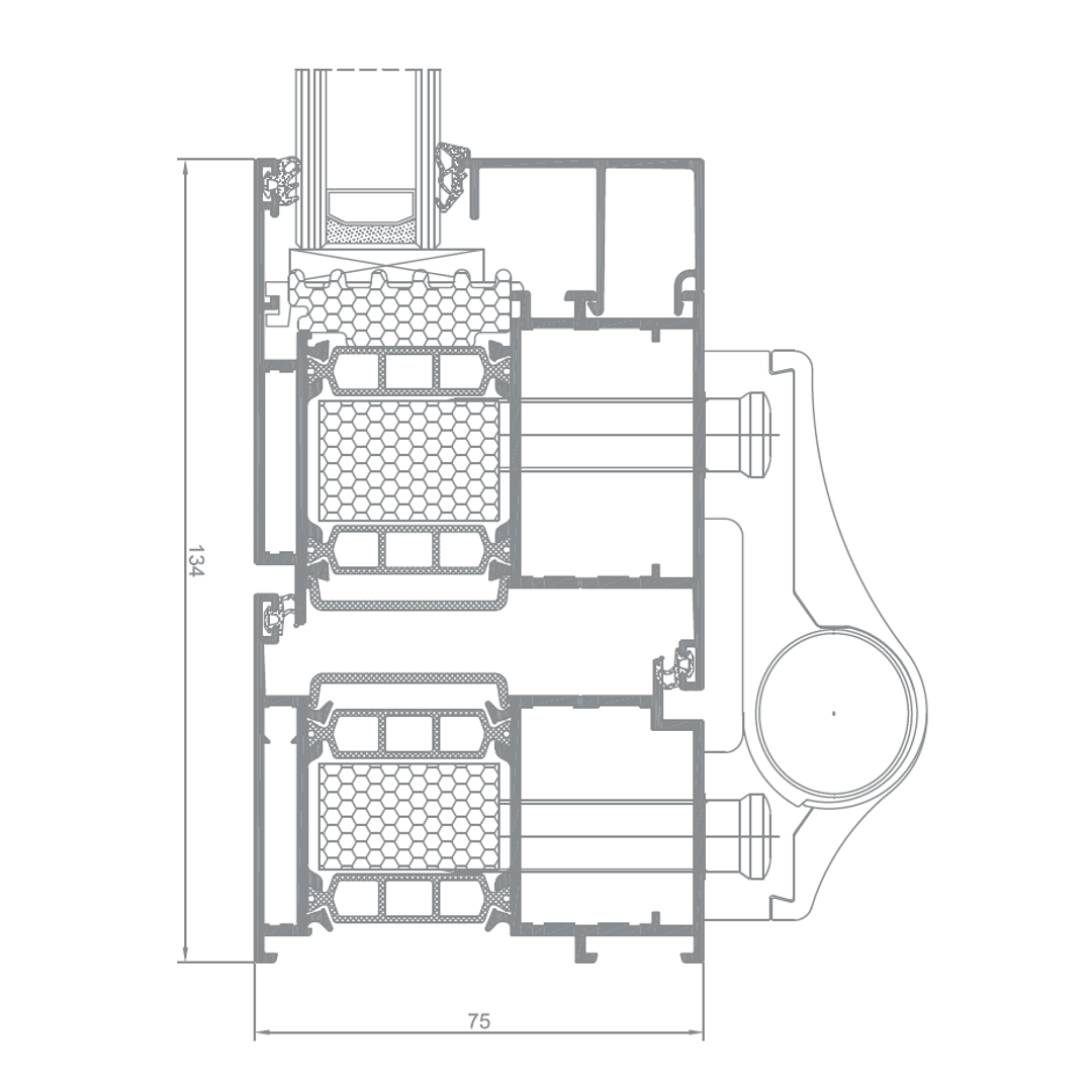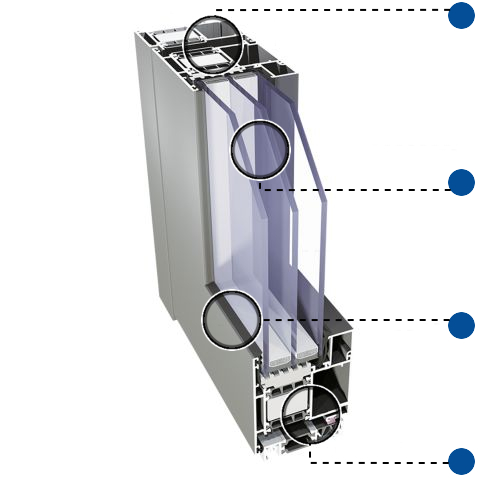 2-fache bis 3-fache Isolierverglasung bis zu einer Stärke von 75 mm (abhängig von der Variante); optional Spezialgläser einsetzbar