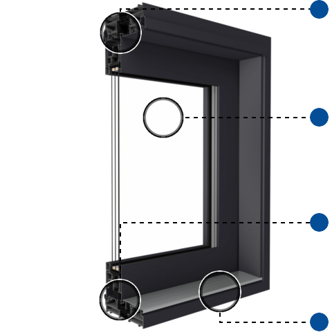 Aluminium Mehrkammerprofil mit thermischer Trennung. Einbautiefe des Rahmens 174 mm und des Flügels 77 mm.