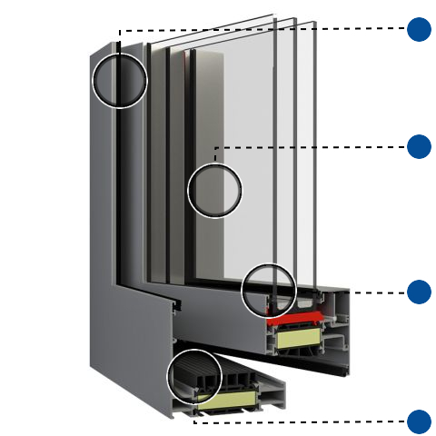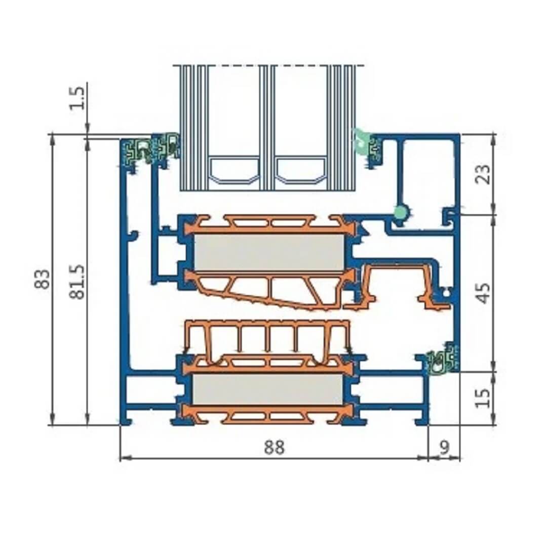 Stabiles Mehrkammerprofil mit verdecktem Flügel für ein äußerst ästhetisches Erscheinungsbild. Bautiefe von 88 mm mit hervorragenden thermischen Parametern.