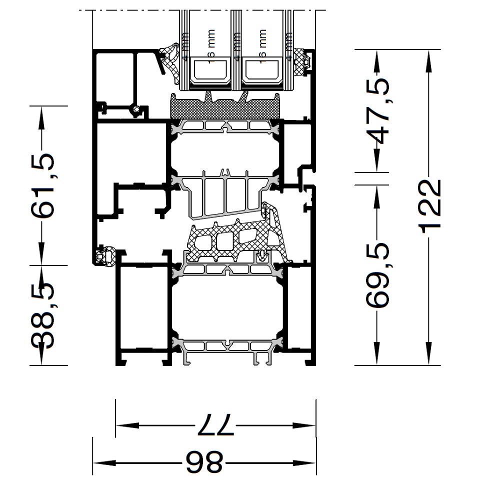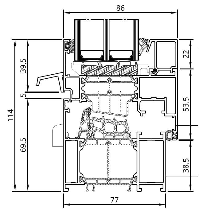- Rahmenbautiefe 77 mm; Flügeltiefe 86 mm