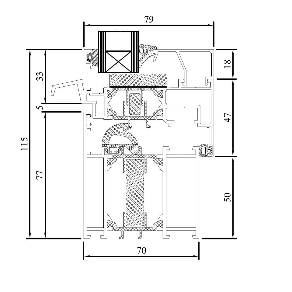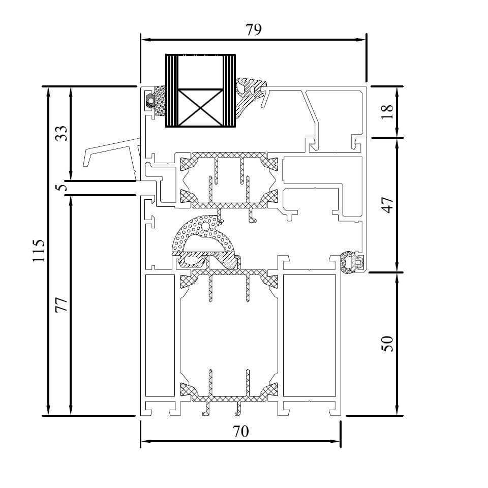 - Rahmenbautiefe 70 mm; Flügeltiefe 79 mm