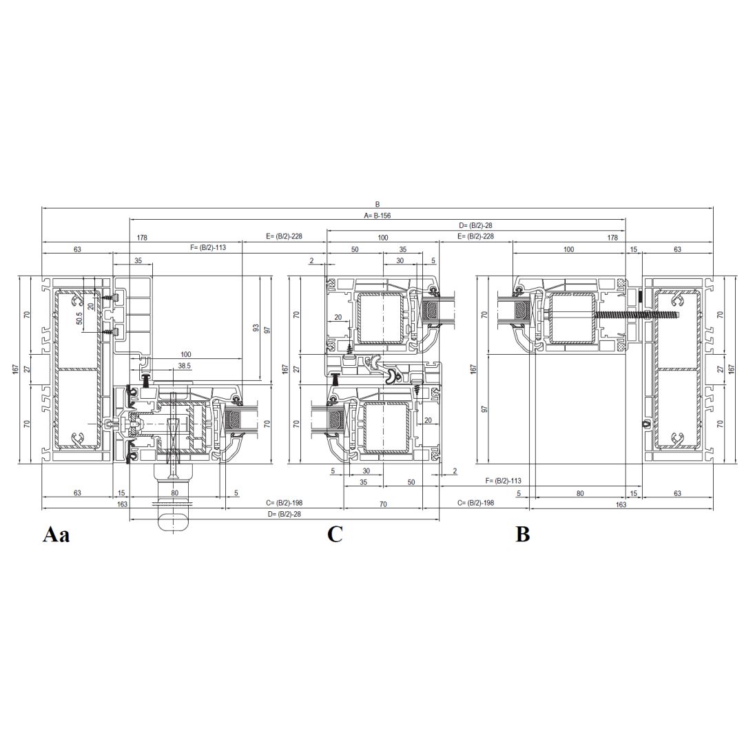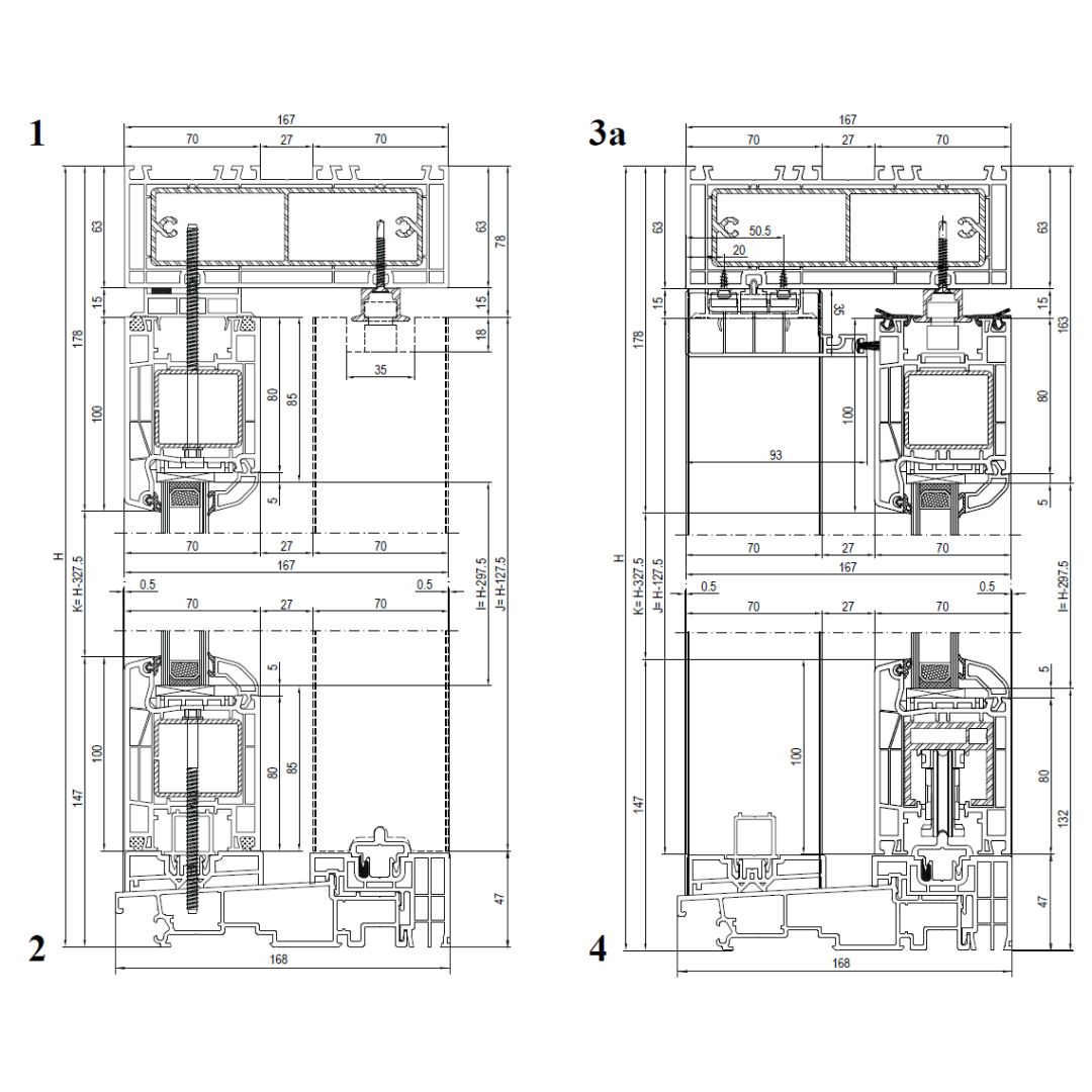 Rahmen: Kammerprofil-System mit einer Bautiefe von 167 mm; Flügel: 4-Kammerprofil mit einer Bautiefe von 70 mm.