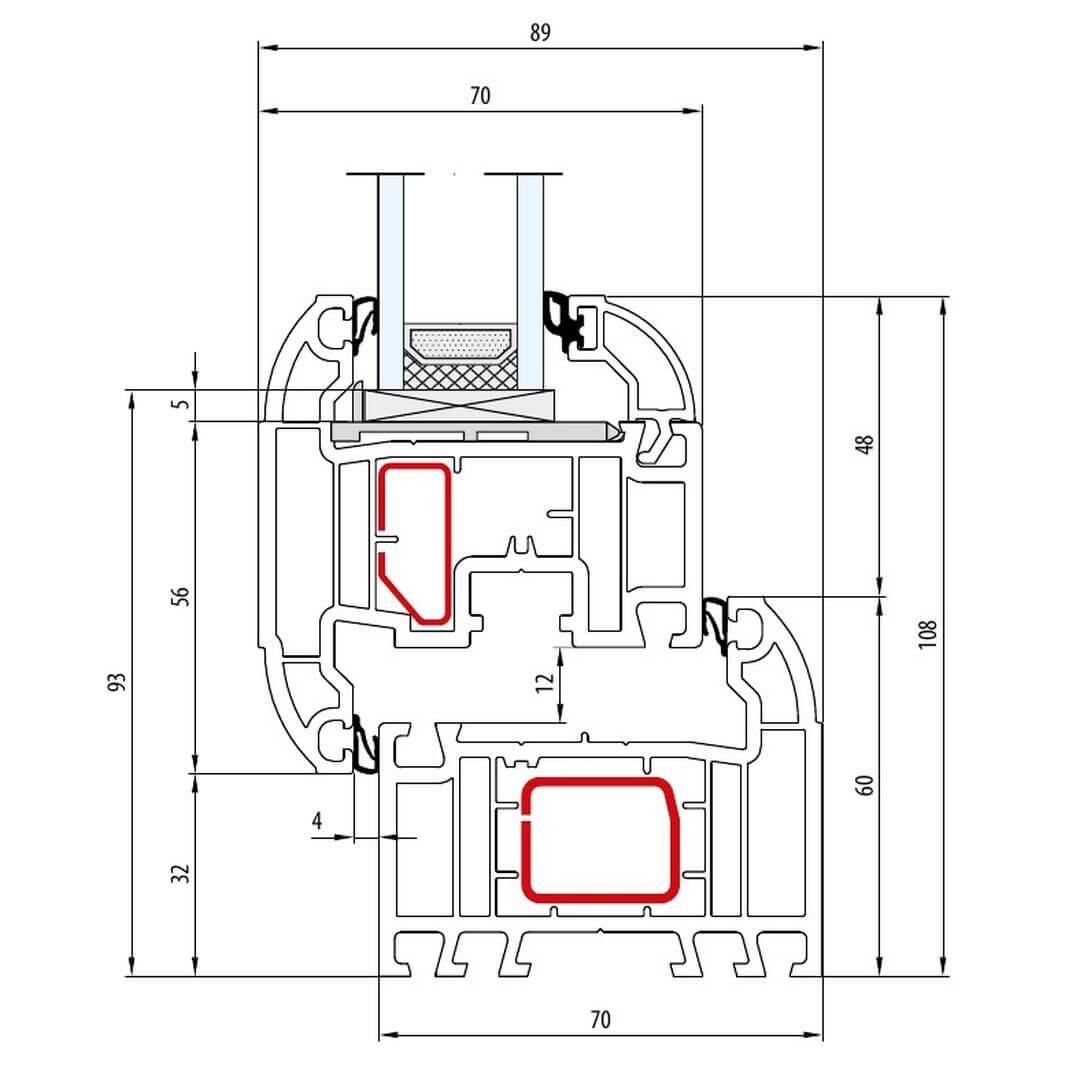 5-Kammersystem in Rahmen und Flügel mit einer Bautiefe von 70mm für eine gute Wärmedämmung und bewährte Stabilität durch die große stahlverstärkte Kammer.