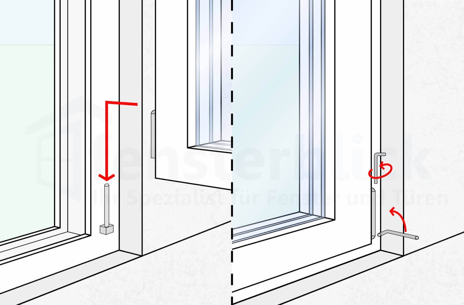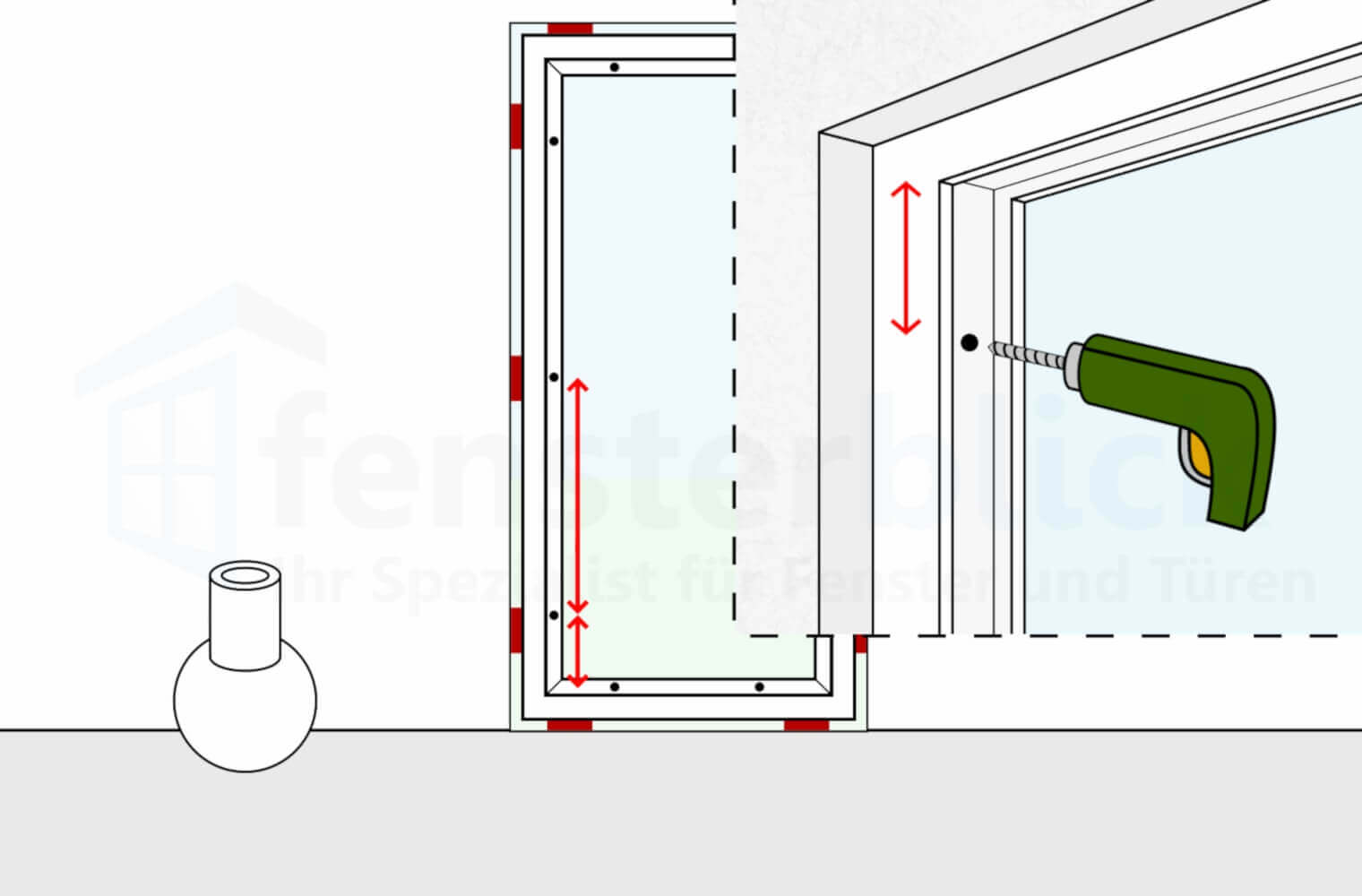 Die Rahmenbohrungen erfolgen mit einem Eisenbohrer im seitlichen Fensterfalz. Achten Sie auf einen Abstand zu dem Rahmenecken und zwischen den Bohrungen. Anschließend werden durch die gleichen Löcher die Wandbohrungen gesetzt (Steinbohrer) und der Rahmen spannungsfrei mit Montageschrauben verschraubt.