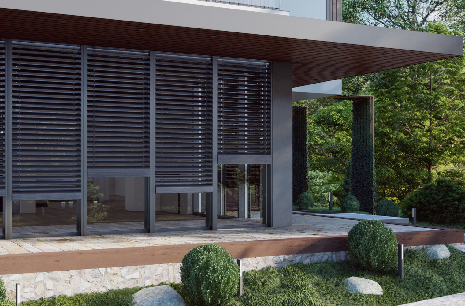 - Bei modernen Architekturen mit bodentiefen Verglasungen eignen sich Raffstores ganz besonders