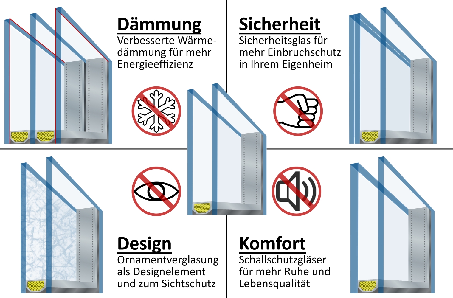 Wärmeschutzverglasung | Schallschutzverglasung | Funktionelles Glas | 4-fach Glas | Strukturglas | Isolierglas | Multifunktionsglas