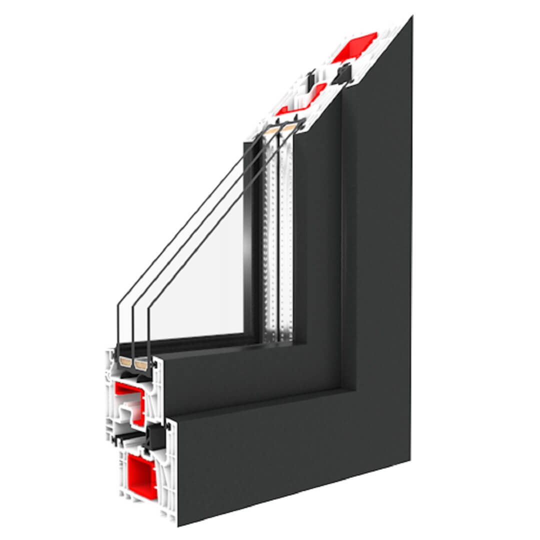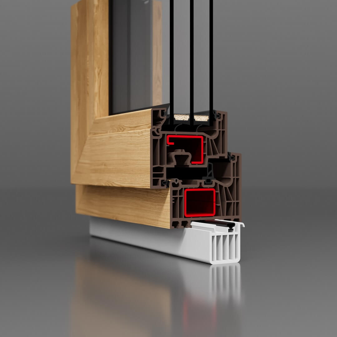 Hoogwaardig 7-kamers profiel met een inbouwdiepte van 82 mm voor uitstekende warmte-isolatie en veiligheid. Grote versterkingskamer met staalversterking.