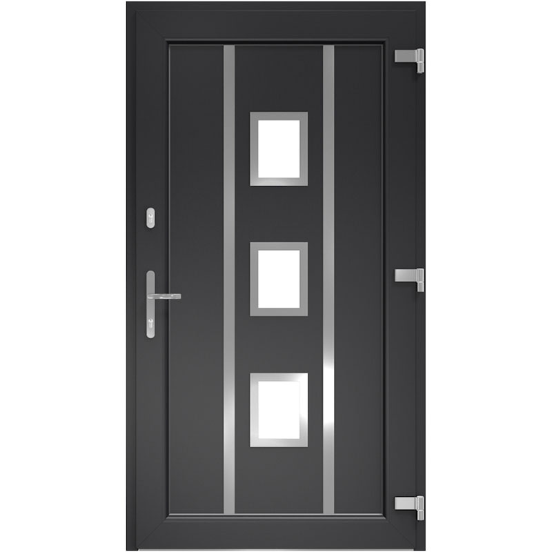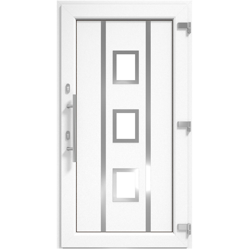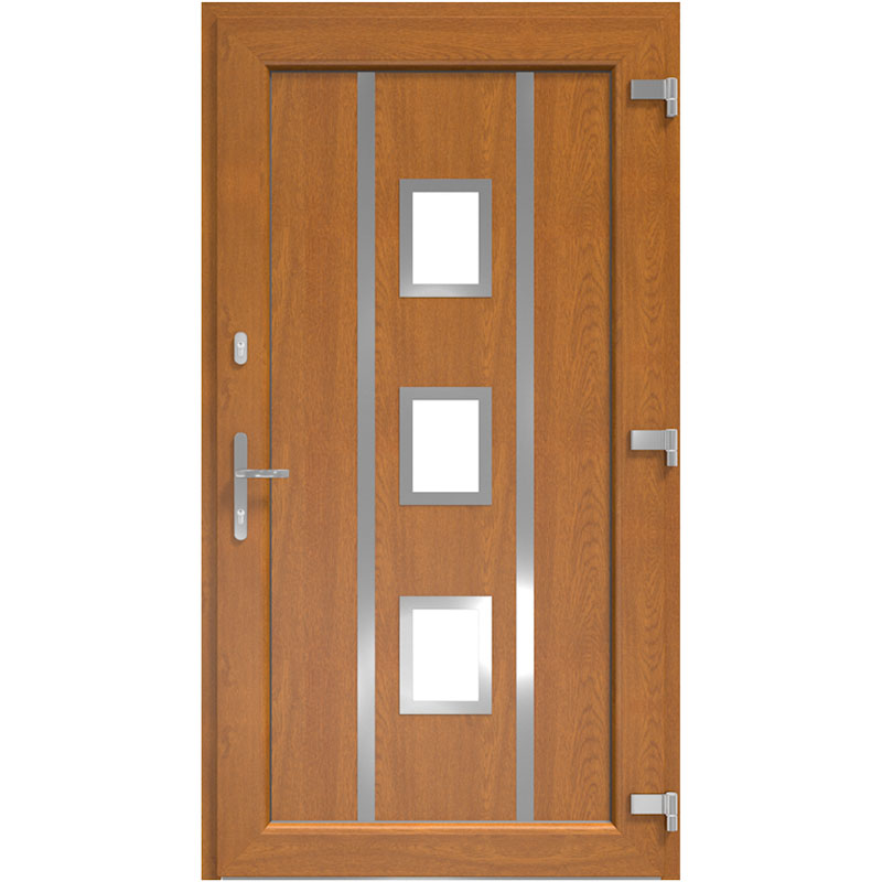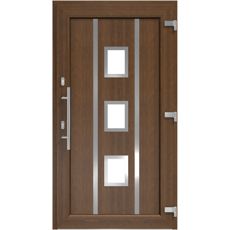 Das DRUTEX Modell Nürnberg besticht durch ein klares und symmetrisches Design: Die drei rechteckigen Glaseinsätze sind von durchgängigen Aluminiumstreifen eingefasst und wirken dadurch besonders elegant und hochwertig. Das Mehrkammern umfassende Kunststoffprofil wird ausschließlich aus Primärrohstoffen hergestellt und trägt maßgeblich zur Stabilität und Wärmedämmung bei. Es ist besonders pflegeleicht und in verschiedenen Farbdekoren erhältlich. Für die ganz individuelle Note lässt sich das Modell Nürnberg noch mit einer Vielzahl an ausgewählten Klinken, Knöpfen und Stoßgriffen ergänzen. Auch in puncto Sicherheit werden keine Abstriche gemacht. Die Sicherheitsverriegelungen sind mit einer 3-fach Haken-Bolz-Verriegelung (Iglo 5), einer automatischen 3-fach-Verriegelung inkl. zwei Stahlbolzen oder einer 5-fach Sicherheitsverriegelung versehen. Marken Haustürbänder aus gezogenem Aluminium verhindern das Verzerren der Türe.