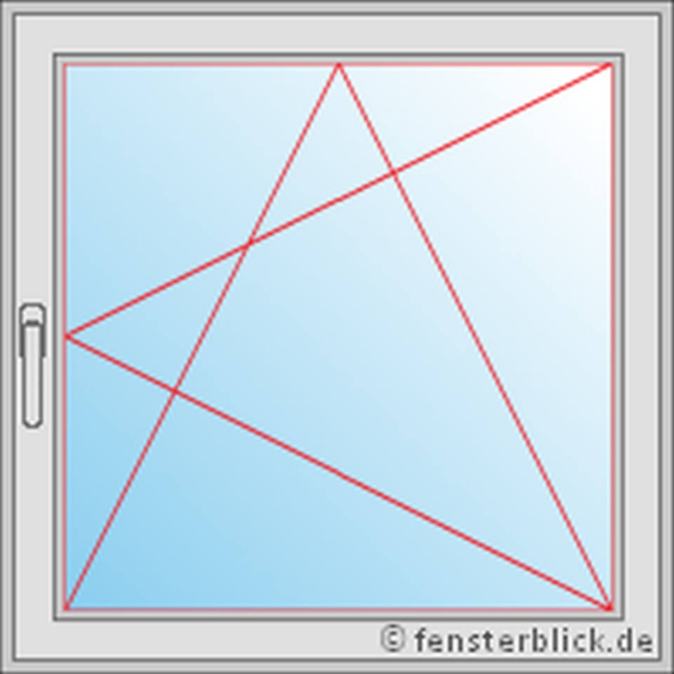 Het raam met draai-kiepfunctie wordt weergegeven met twee open driehoeken die 90° ten opzichte van elkaar zijn gedraaid en informatie geven over de openingsrichting. Bij een draai-kiepraam links bevindt de greep zich aan de rechterzijde. Het raam kan zowel naar links worden geopend als worden gekiept.