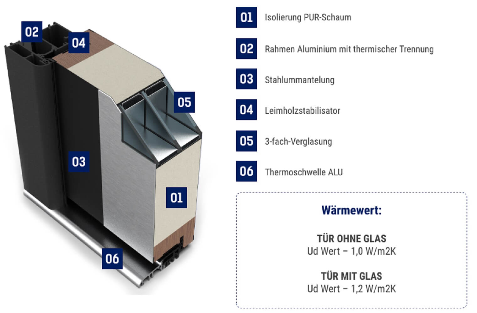 Die ATS 56 Nebeneingangstüren sind bis auf einen Unterschied ganz genau wie die ATU 56 Nebeneingangstüren. Beim Profilaufbau besitzt die ATS-Serie Stahl Blockzarge und die ATU-Serie eine Aluminiumzarge mit thermischer Trennung.