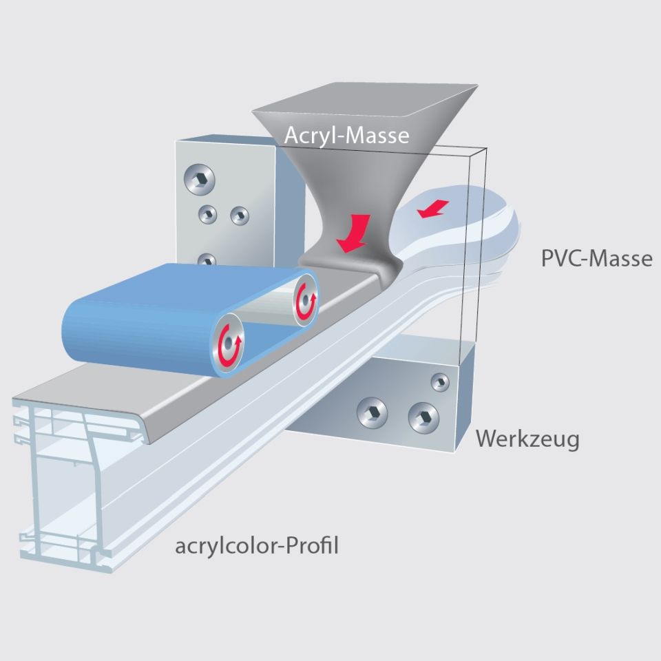 Acrylcolor entsteht durch ein Coextrusions-Verfahren womit der weiße PVC-Grundkörper und das farbige Acrylglas (PMMA) miteinander verschmolzen werden. Acrylglas bewährt sich durch seine Qualität als hochwertiges Produkt in der Automobilindustrie (Rückleuchten) sowie in der Innenarchitektur.