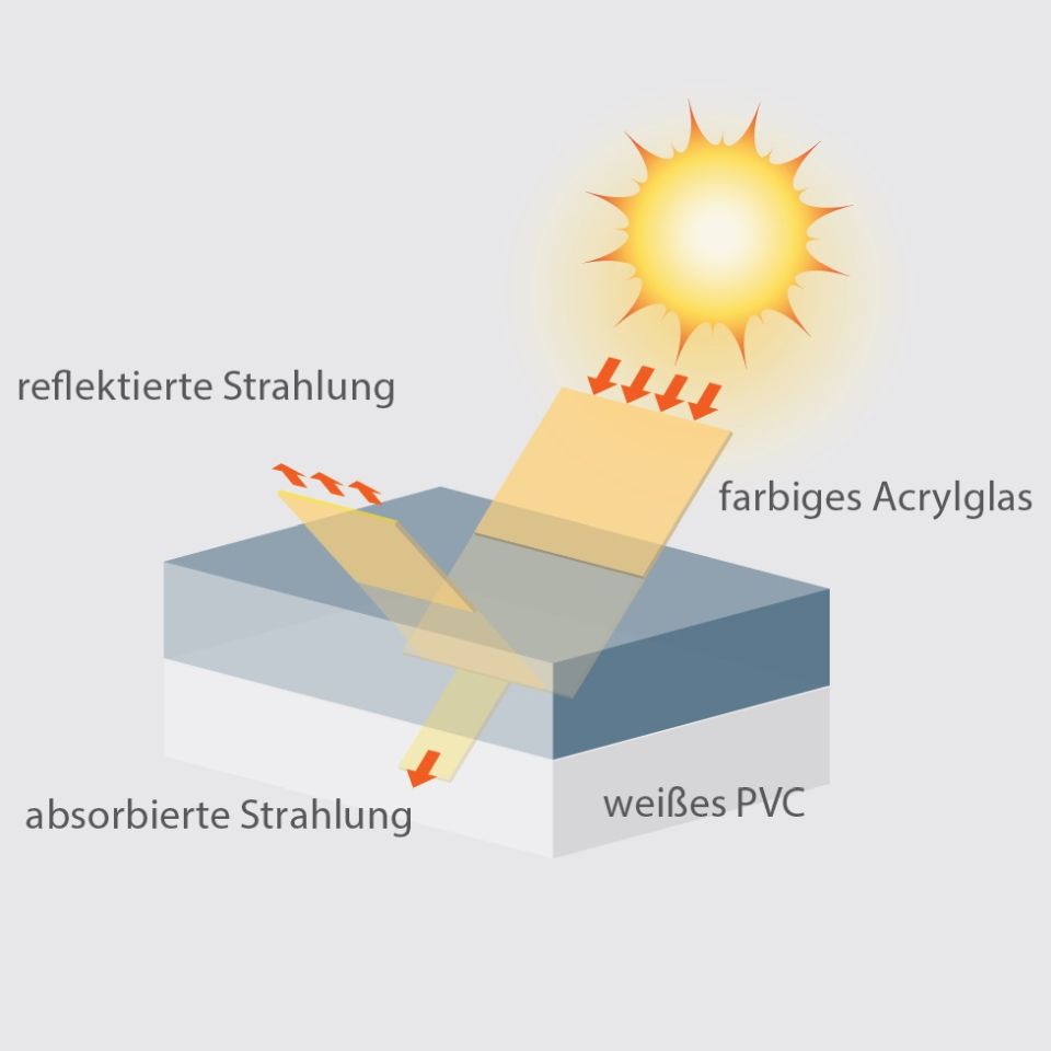 Acrylcolor ontstaat door een co-extrusieproces waarbij het witte PVC-onderlichaam en het gekleurde acrylglas (PMMA) met elkaar versmelten. Acrylglas bewijst zich door zijn kwaliteit als een hoogwaardig product in de automobielindustrie (achterlichten) evenals in de interieurarchitectuur.