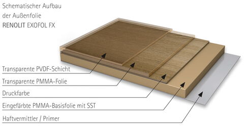 Die oberste Folienschicht ist dabei immer transparent und schützt Ihre Folie vor dem Verblassen durch UV-Strahlen. Die unterste Folie besteht meist aus einem Haftvermittler damit die Folie unproblematisch an den Rahmen geklebt werden kann. In der Mitte befindet sich Ihre gewünschte Dekor-Folienfarbe. Alle weiteren Folien-Schichten unterscheiden sich je nach Produkt-Serie.