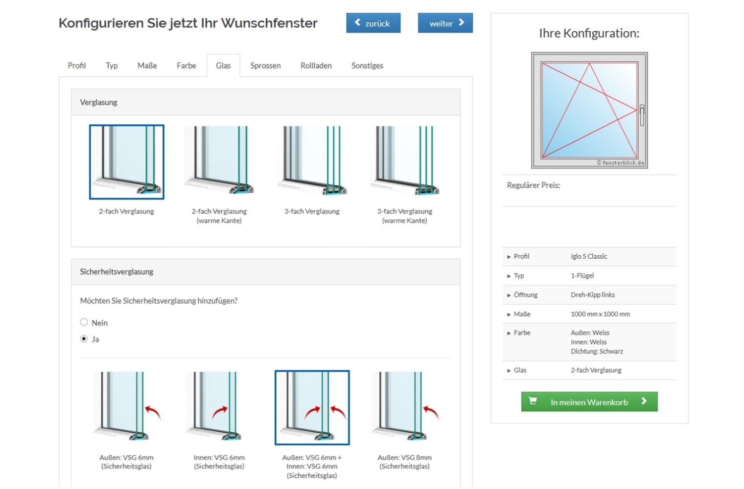 Fenster mit VSG-Glas konfigurieren