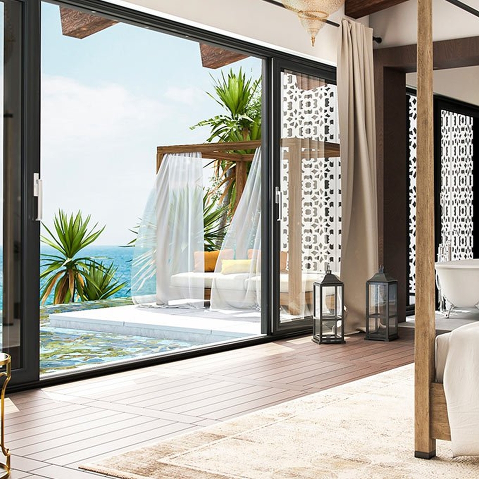 Die doppelflügelige Hebeschiebetür gehört nicht ohne Grund zu den beliebtesten Terrassentüren. Mit einer Breite von 1,7 m bis zu 6,5 m und einer Höhe von 1,4 m bis zu 2,6 m je nach Profil und Material beweist sie ihre Flexibilität in Bezug auf die Maße.