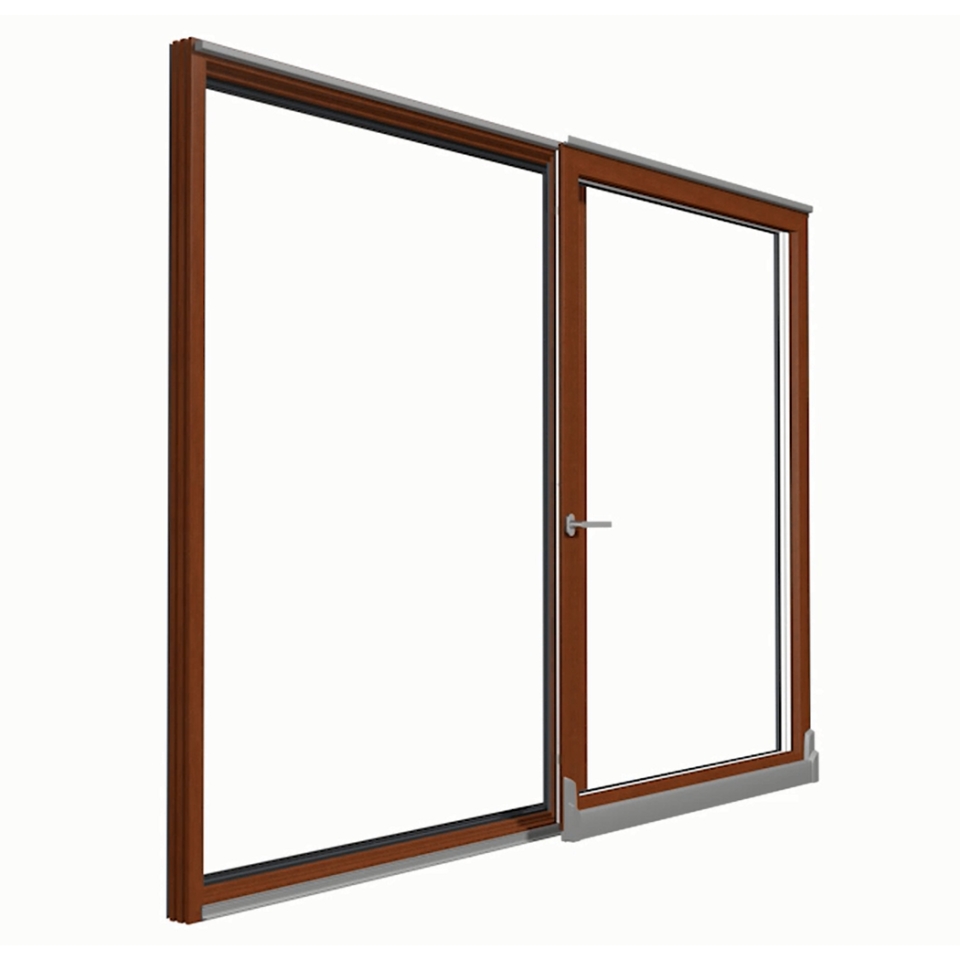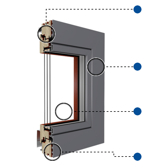 Mehrschichtenverklebtes massives Kiefer-, Merantikantholz 450+ oder Lerchenkantholz mit Bautiefen von 68 mm, 78 mm oder 88 mm. Dichtungen aus TPE und EPDM.
