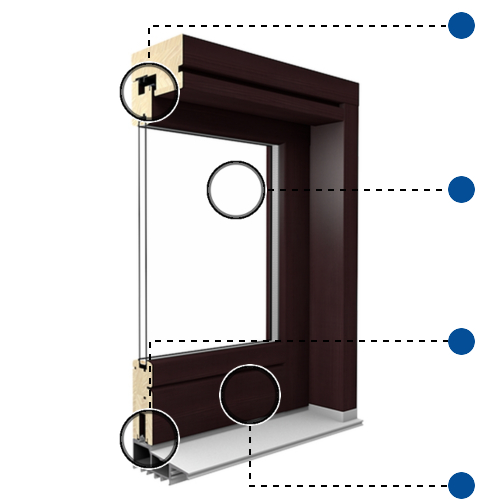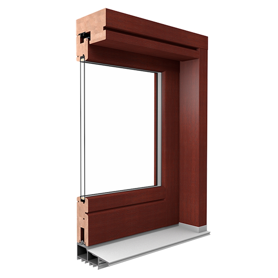 Mehrfach schichtverklebtes Kiefern-, Lärchen- oder Merantiholz mit Flügel-Bautiefen von 68 mm, 78 mm oder 88 mm.
