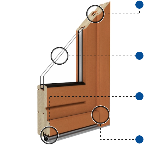 Massives Holz aus Kiefer, Meranti oder Lärche in Mehrschichtverklebung und Bautiefen 68mm, 78mm und 88mm. Falzdichtung aus TPE.