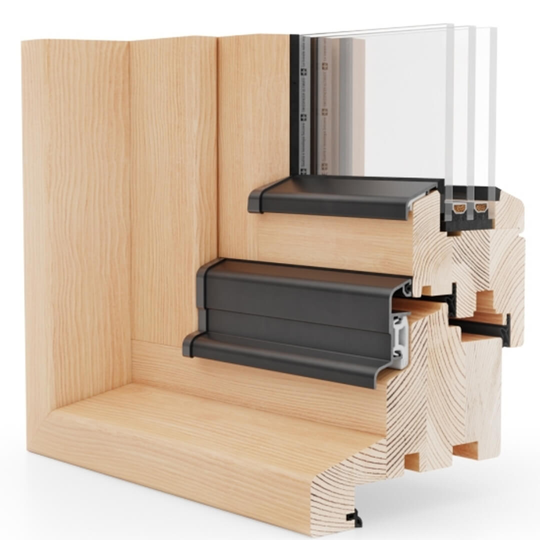 De profielen zijn gemaakt van meervoudig verlijmd hout (3-4 lagen), wat zorgt voor hoge statische waarden, vormstabiliteit en een lange levensduur. Het oppervlak wordt beschermd door een vierlaagse verfsysteem die zowel beschermt tegen schadelijke weersomstandigheden als de natuurlijke schoonheid van het hout benadrukt. Het Nature 80 profiel kan op maat worden gemaakt: kies uit verschillende houtsoorten zoals den, vuren, meranti of eik en een breed scala aan oppervlaktebehandelingen – van gelazuurde kleuren tot RAL-kleuren, helder gelakt of onbehandeld.