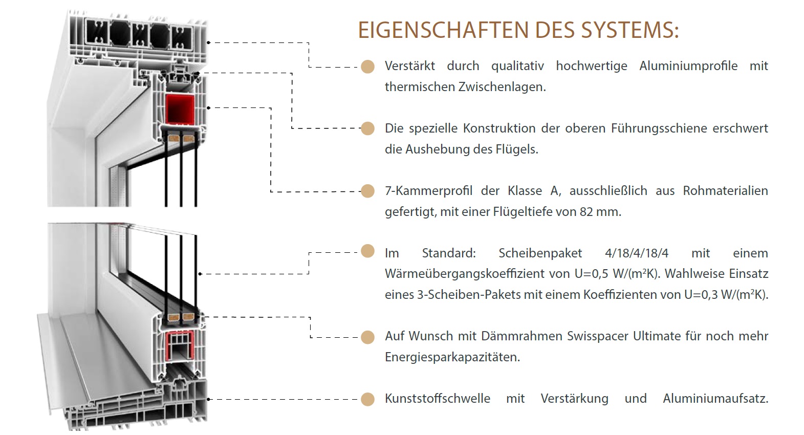 - 7-Kammerprofil der Klasse A mit einer Bautiefe von 82 mm für einen stabilen Aufbau und eine lange Nutzungsdauer.