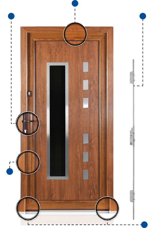 Mit dem 5-7-Kammeraufbau der Iglo Energy Kunststofftüren werden hervorragende thermische Wärmeisolationswerte mit einem zeitlosen Design verknüpft. Die Verwendung von hochwertigen Werkstoffen für die Kunststoffprofile, der Einsatz von modernen Aluminium-Türschwellen mit thermischen Trennblättern sowie das innovative Dichtungssystem aus einer geschäumten EPDM Mitteldichtung gewährleisten eine optimale Energieeinsparung. Für eine hohe Sicherheit mit Bestnoten sorgen die integrierten 3-fach Verriegelungen vom Markenhersteller MACO. Eine optimale Funktionalität und Beständigkeit wird mit den Aluminium Türschanieren HAPS-P700 erreicht. Zusätzlich können die Eingangstüren mit einer breiten Farbgebung, verschiedenen Panel- Füllungen und zahlreichen Zusatzausstattungen ideal angepasst werden. Die große Auswahl und individuellen Gestaltungsmöglichkeiten lassen jede Wunschtür Wirklichkeit werden.