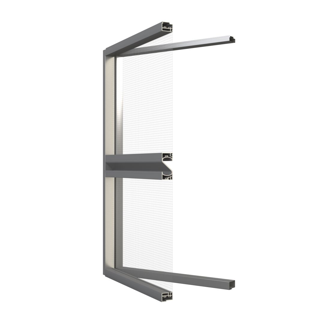 Hergestellt aus stranggepresstem Aluminium mit einer langlebigen Pulverbeschichtung, ist das System widerstandsfähig gegen Witterungseinflüsse. Das Netz aus PVC-beschichtetem Glasfasergewebe ist in Schwarz oder Grau erhältlich und bietet eine hohe Abriebfestigkeit.