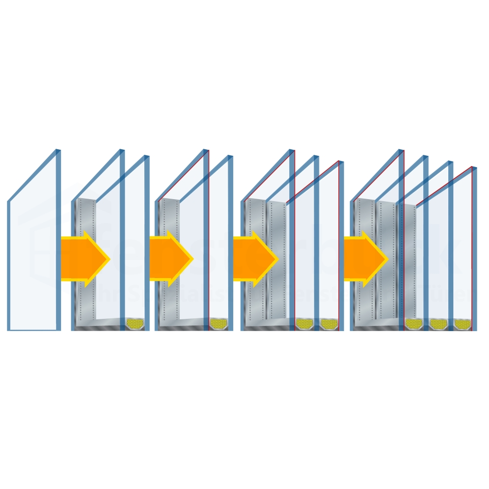 In oudere gebouwen wordt meestal dubbel glas gebruikt, terwijl in nieuwere gebouwen wordt gekozen voor triple of zelfs vierdubbel glas. Hiermee kunnen uitstekende U-waarden worden bereikt. Ook de geluidsisolatie wordt beïnvloed door het aantal glaslagen en kan verder worden verbeterd door speciaal geteste combinaties van glas van verschillende diktes.