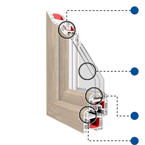 Schmales 5-Kammer-System der Profilklasse A für eine größtmögliche Verglasung mit einer Bautiefe von 70 mm. Das Kunststoffprofil besitzt zudem eine große Verstärkungskammer mit verschraubter Stahleinlage.