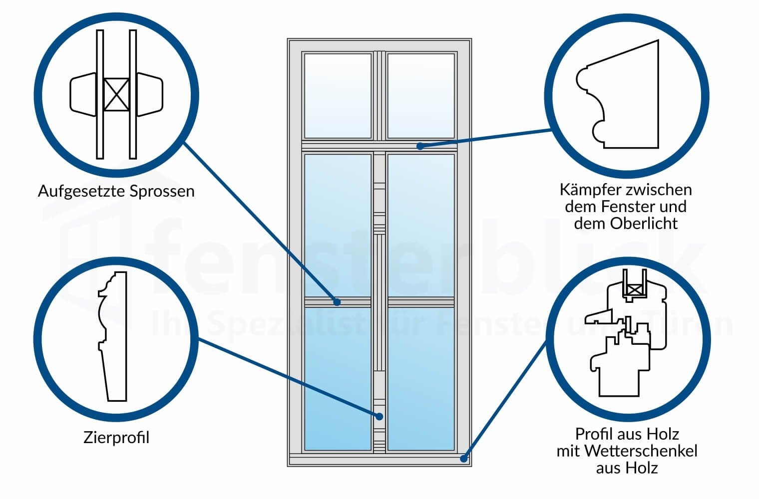 Details over monumentale kozijnen: waterslagen, sierelementen, tussenregels en roeden