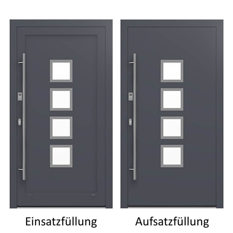Bei einer Aufsatzfüllung wird diese auf den Rahmen aufgesetzt. Aufgrund der daraus entstehenden planen Oberfläche bezeichnet man diese Fülltechnik auch als flügelüberdeckend. Durch die vollständige Überdeckung des Türflügels ist eine stärkere Wärmedämmung möglich. Je nach Wunsch kann man die Aufsatzfüllung einseitig oder beidseitig ins Haustür-Design integrieren.