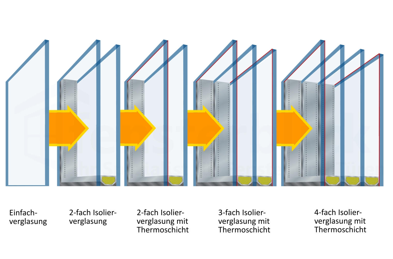 Moderne Fenster bestehen heute aus sogenannten Isolier-Verglasungen. Gerne werden diese auch als Mehrfachverglasungen bezeichnet, denn Sie bestehen auch aus einem mehrschichtigen Aufbau. Je nachdem welche Dämm-Wirkung man erreichen möchte, wird entsprechend die Fachverglasung ausgewählt. Heute sind folgende Verglasungen gängig: