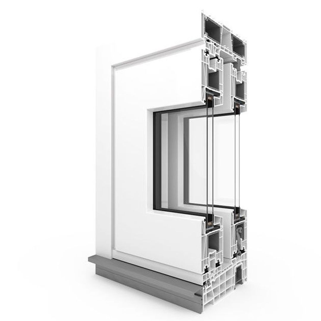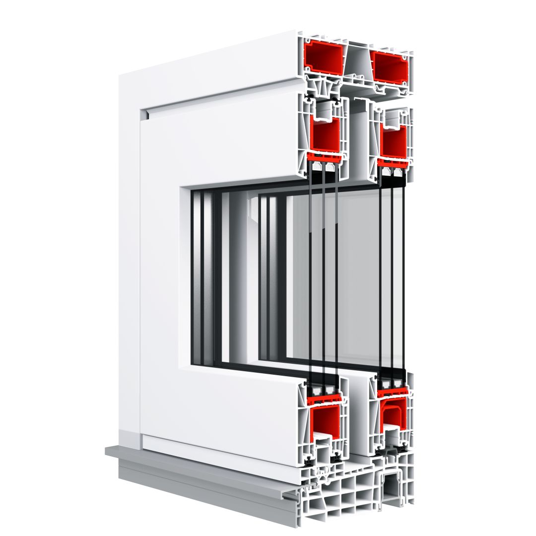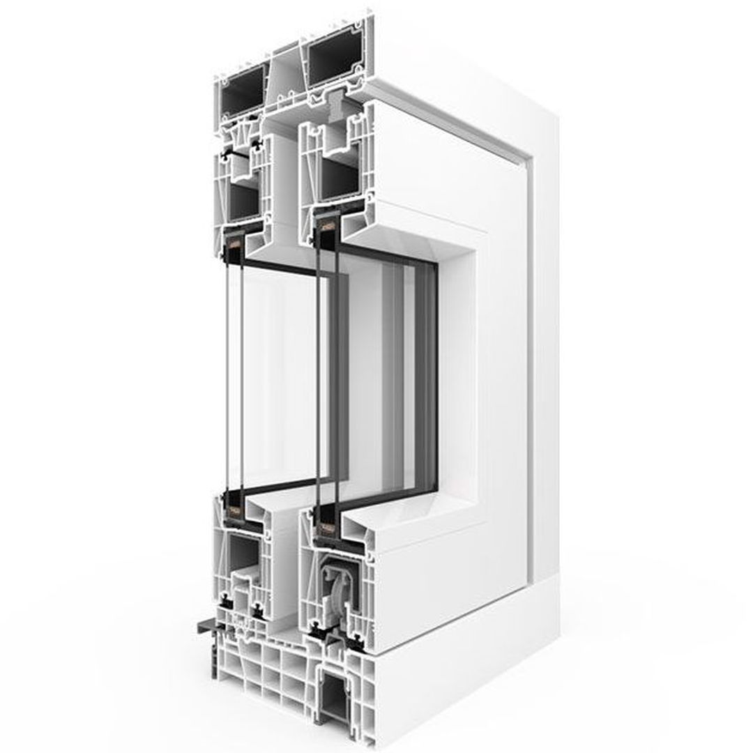 Rahmen: 5-Kammerprofil-System mit einer Bautiefe von 194 mm; Flügel: 5-Kammerprofil mit einer Bautiefe von 82 mm.