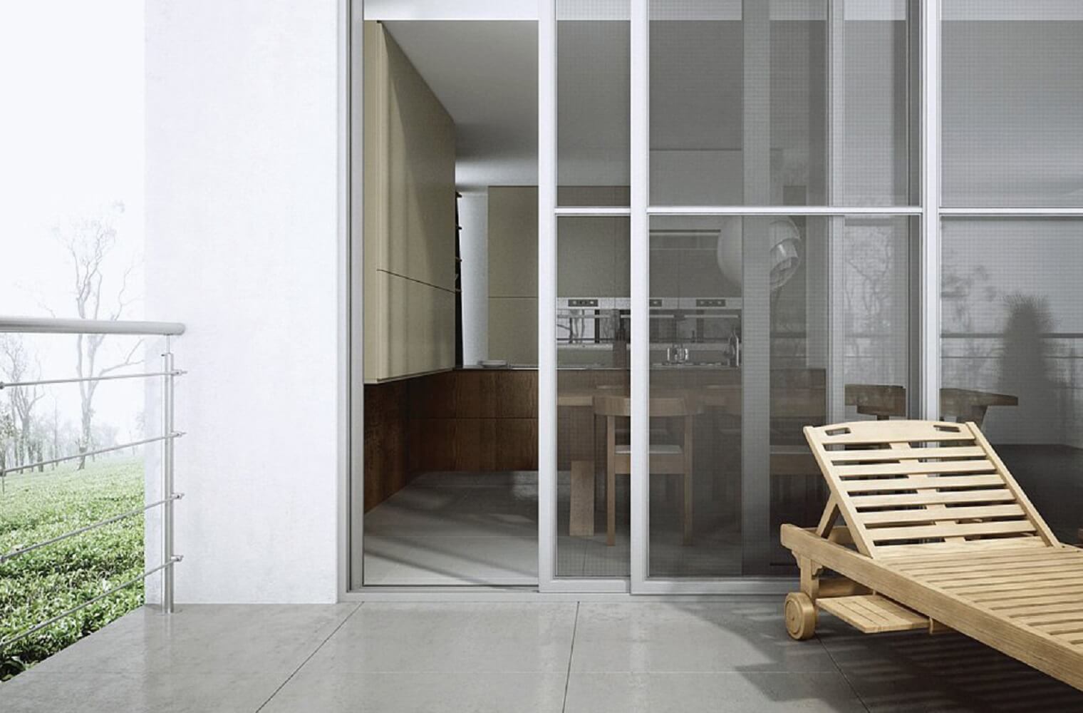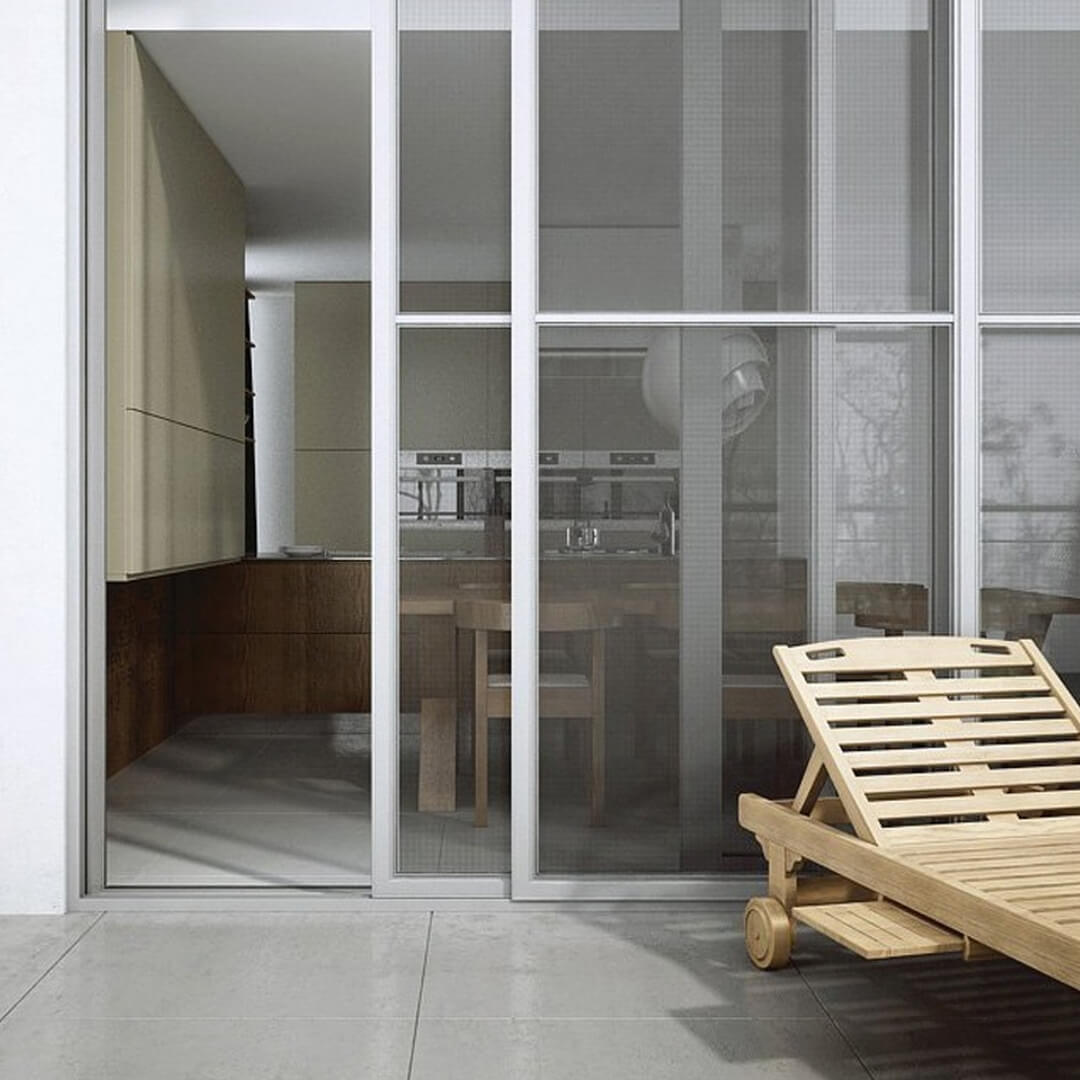 Funktioniert hervorragend mit Schiebetüren mit flacher Schwelle. Das Insektenschutzgitter kann in einem Mehrreihensystem montiert werden
