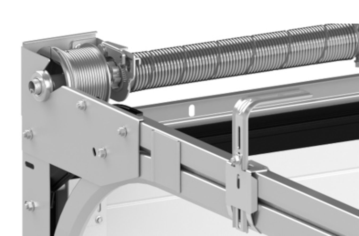 Hier sieht man die Führungsschienen des Sektionaltors am oberen Bogen vorne. Über den obersten Bogen bewegt sich meist nur die oberste Sektion des Sektionaltors. Die anderen Sektionen verlaufen über den unteren Bogen.