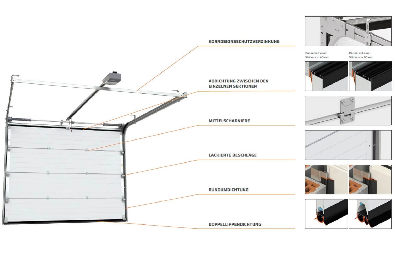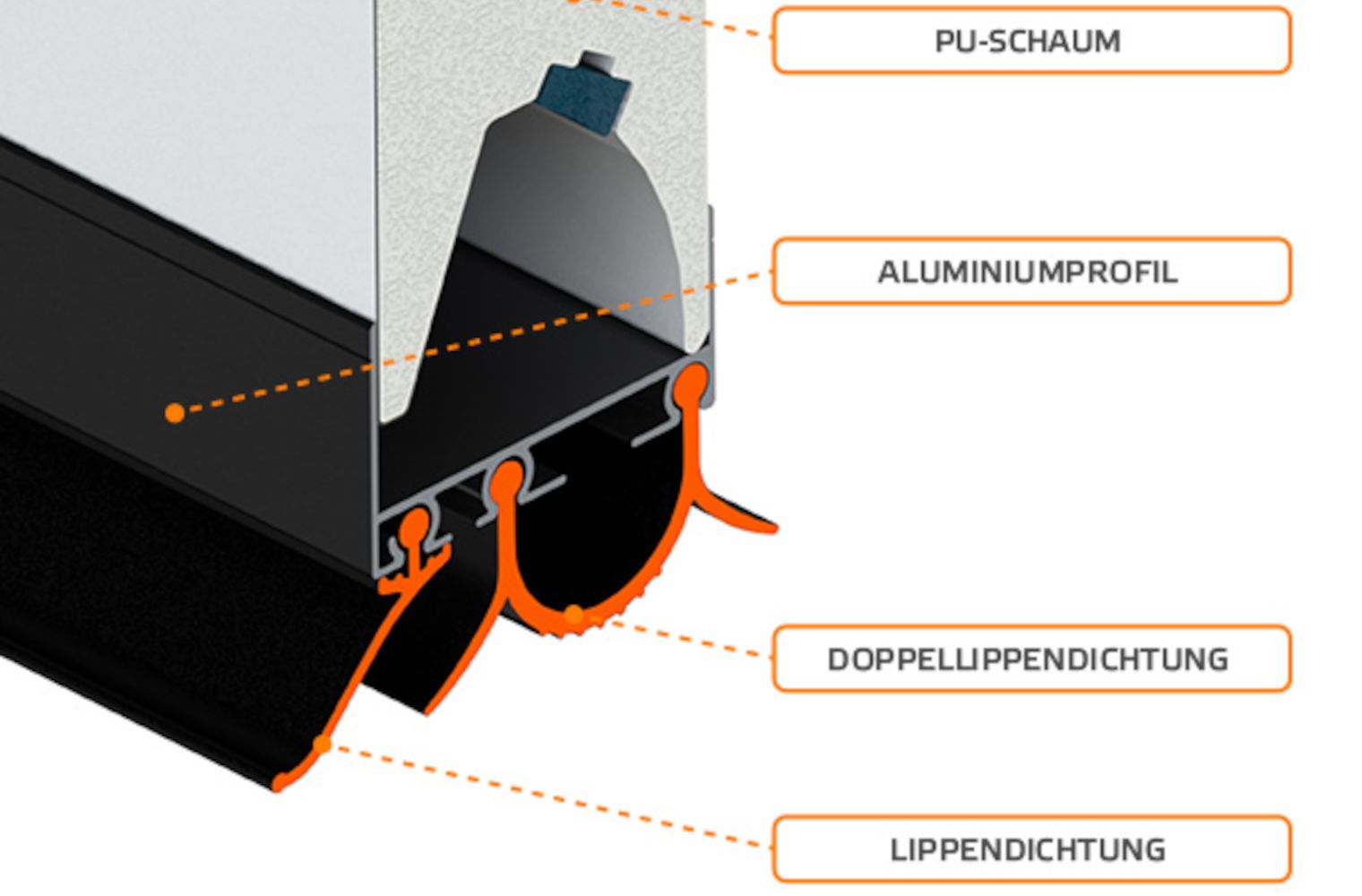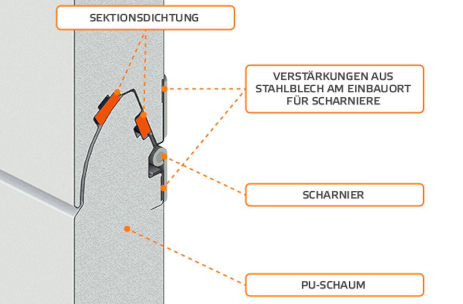 Die Lamellen-Paneele sind mit PU-Schaum befüllt. Die Sektionen greifen ineinander ein und werden mit zwei Dichtungen unterstützt. Die Scharniere verbinden die Sektionen miteinander.