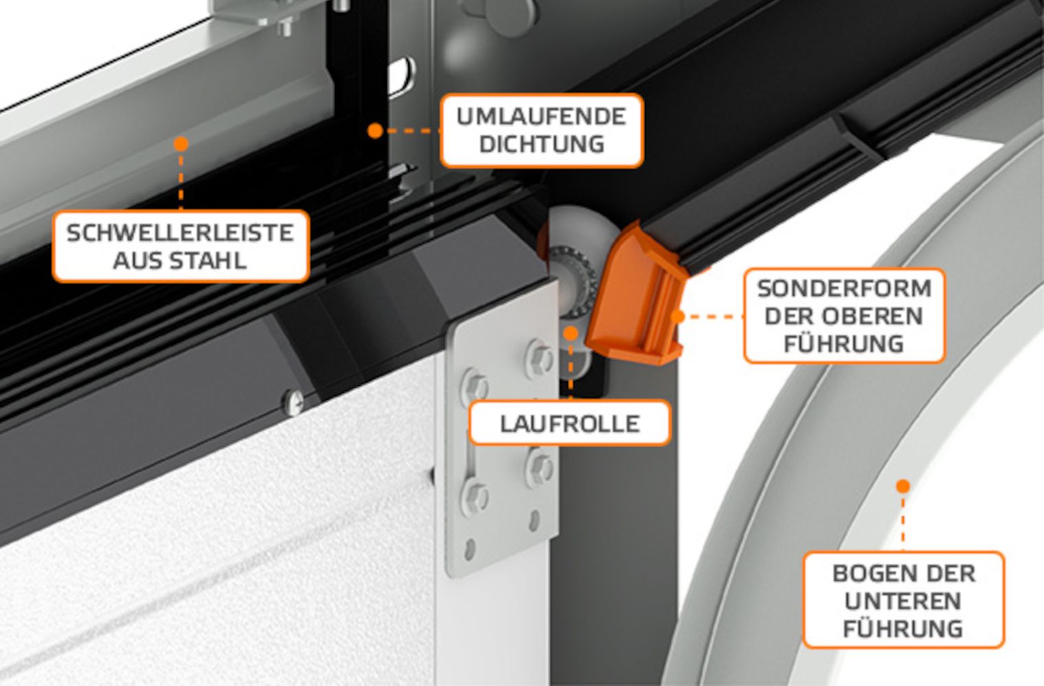 Die Laufrolle der obersten Sektion fährt beim Hochfahren des Sektionaltors über die obere Führung. Alle darunter liegenden Sektionen fahren über den Bogen der unteren Führung hoch.