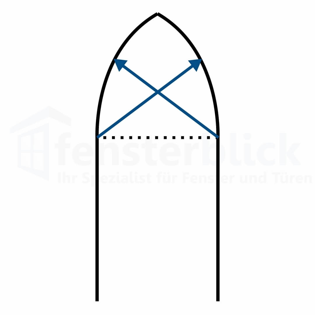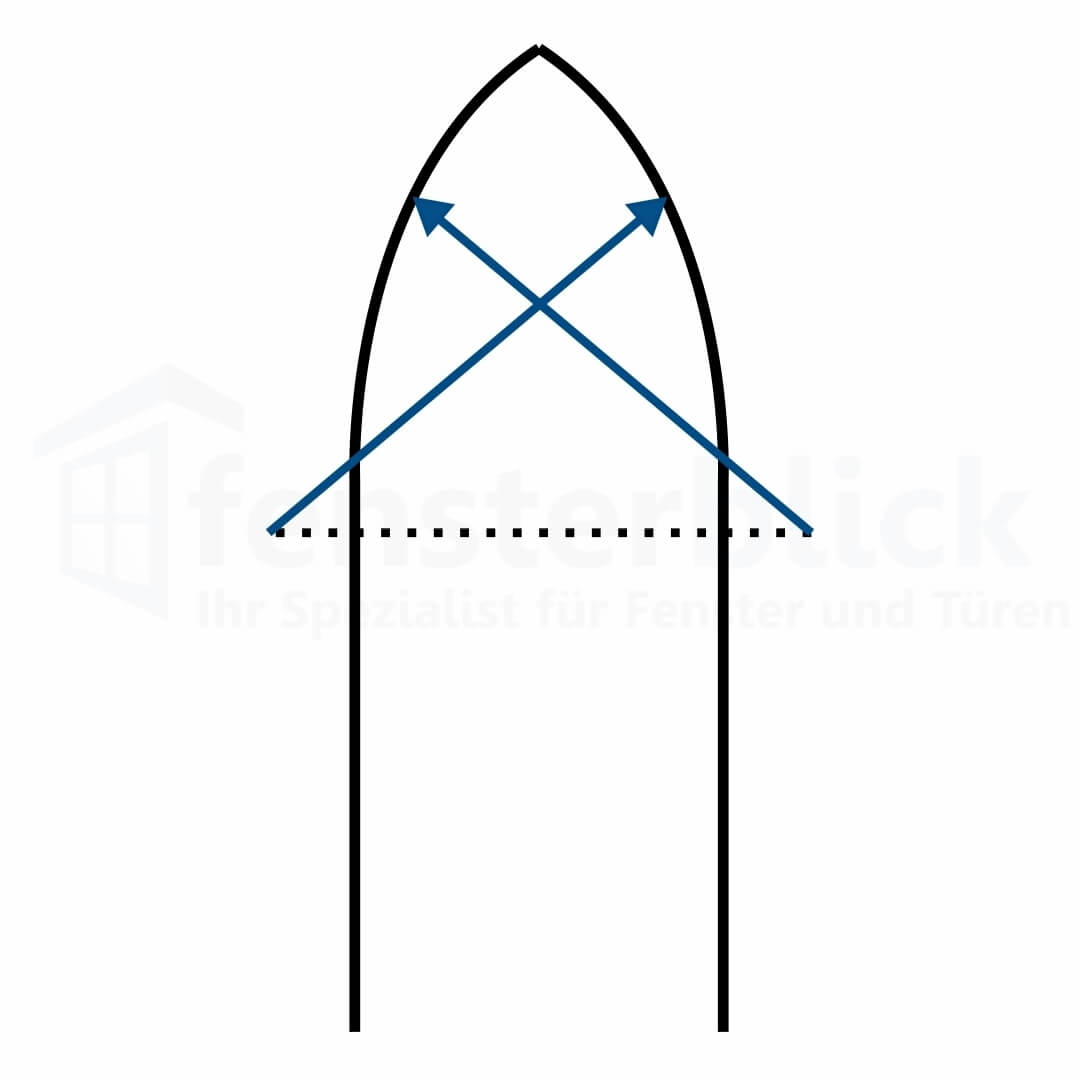 Man setzt den Zirkel genau an den beiden Enden des Fensters an und zieht jeweils einmal den Halbkreis von den beiden Ecken nach oben. Der Schnittpunkt wird auch als Punkt S bezeichnet. Der Spitzbogen ist bei dieser Variante mittelgroß.