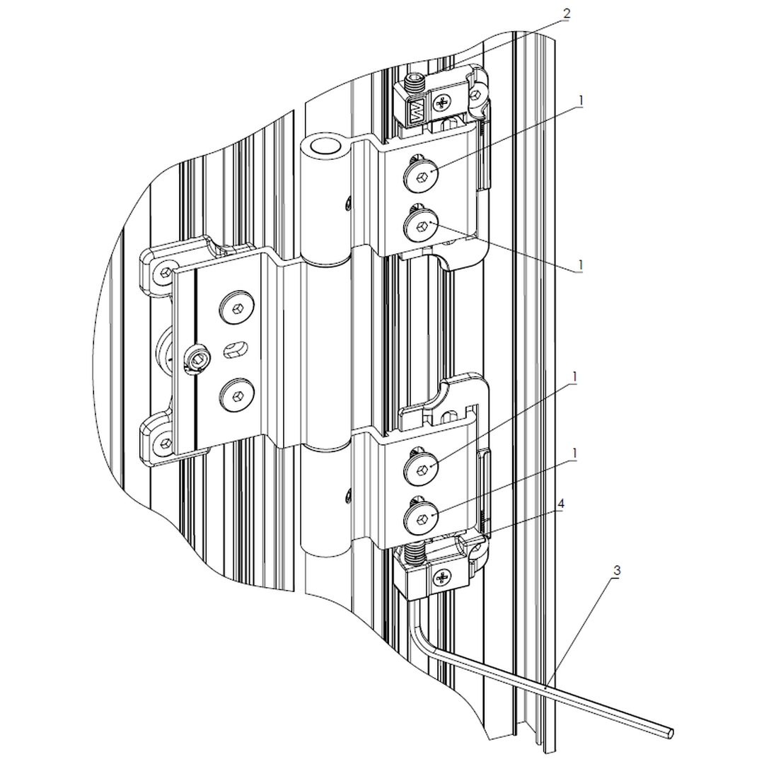 Öffnen Sie für einen ungehinderten Zugang zu den Rollenbändern den Türflügel vollständig. Lösen Sie mit dem Sechskantschlüssel die vier Hauptschrauben (1) am oberen und unteren Rahmenbandteil von jedem Türband. Drehen Sie die obere Einstellschraube (2) überall heraus, nun kann sich die Adjustierung auf den Flügel übertragen. Die untere Einstellschraube (4) reguliert die Höhe des Flügels. Durch eine Drehung um 360° wird der Flügel um 1,25 mm angehoben bzw. abgesenkt. Nehmen Sie die Einstellung an allen Bändern möglichst gleichmäßig vor. Abschließend drehen Sie die entfernten Schrauben (2) wieder ein und ziehen die Hauptschrauben (1) fest.