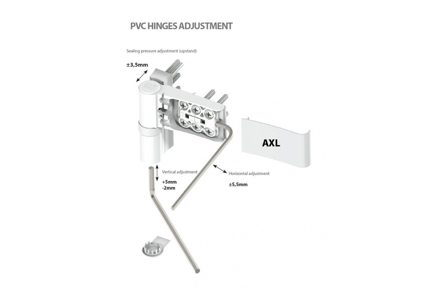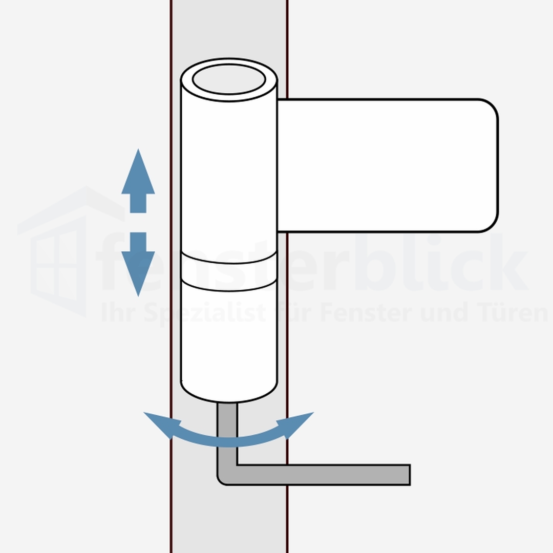 Die Höhe des Türflügels kann bei geschlossener Tür vorgenommen werden. Entfernen Sie dazu vom unteren Türband die runde Abdeckkappe der Vertikalschraube. Platzieren Sie den 6 mm Sechskantschlüssel und drehen Sie diesem im Uhrzeigersinn, um den Flügel anzuheben. Eine Drehung in die entgegengesetzte Richtung bewirkt ein Absenken (bei rechtsseitigem Band). Justieren Sie anschließend auch die anderen Türbänder leicht nach und setzen Sie alle Abdeckkappen wieder ein.