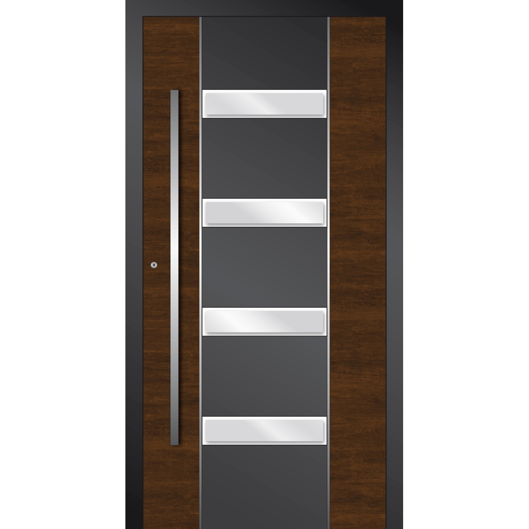 Die Aluminiumfüllungen sind in vielen Mustern und Farben erhältlich. Die während der Produktion ausgeührten Ausfräsungen mit verschiedenen Formen, Verzierungen sowie die Anwendung von Verbundverglasung lassen eine Vielzahl von Kombinationen und Varianten zu. Dadurch können die Türen sowohl in modernen Häusern, als auch in klassischen Bauwerken eingebaut werden. Sie bilden in jeder Kombination einen wunderschönen, auffallenden Hauseingang, und verleihen der Fassade besonderen Charme.