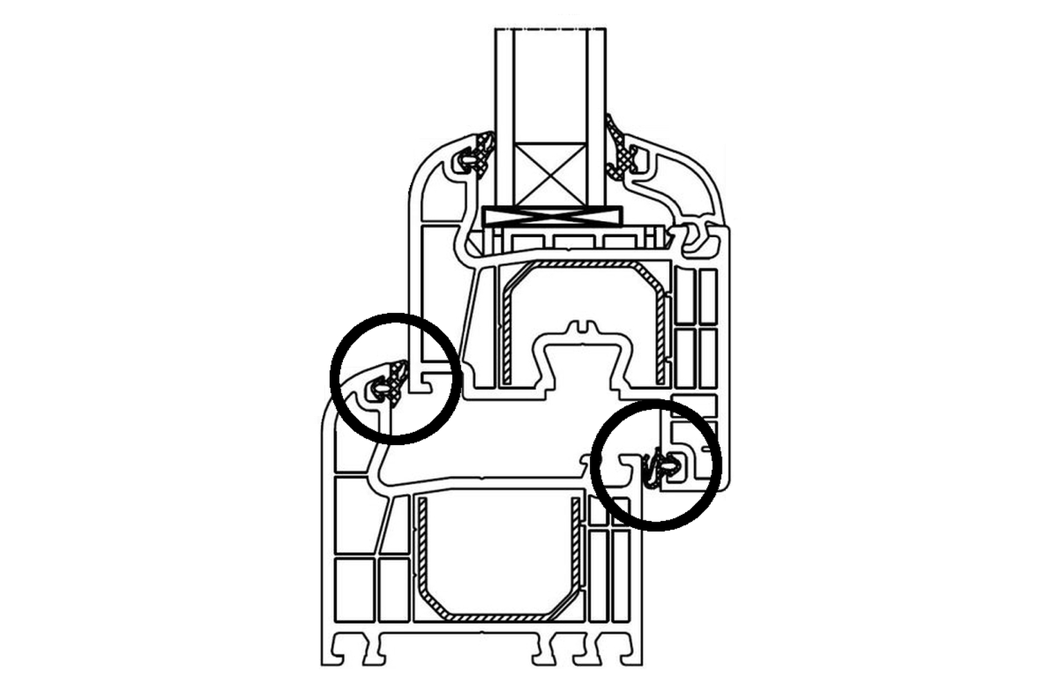 Querschnitt von Blendrahmen & Flügelrahmen mit 2 Dichtungen