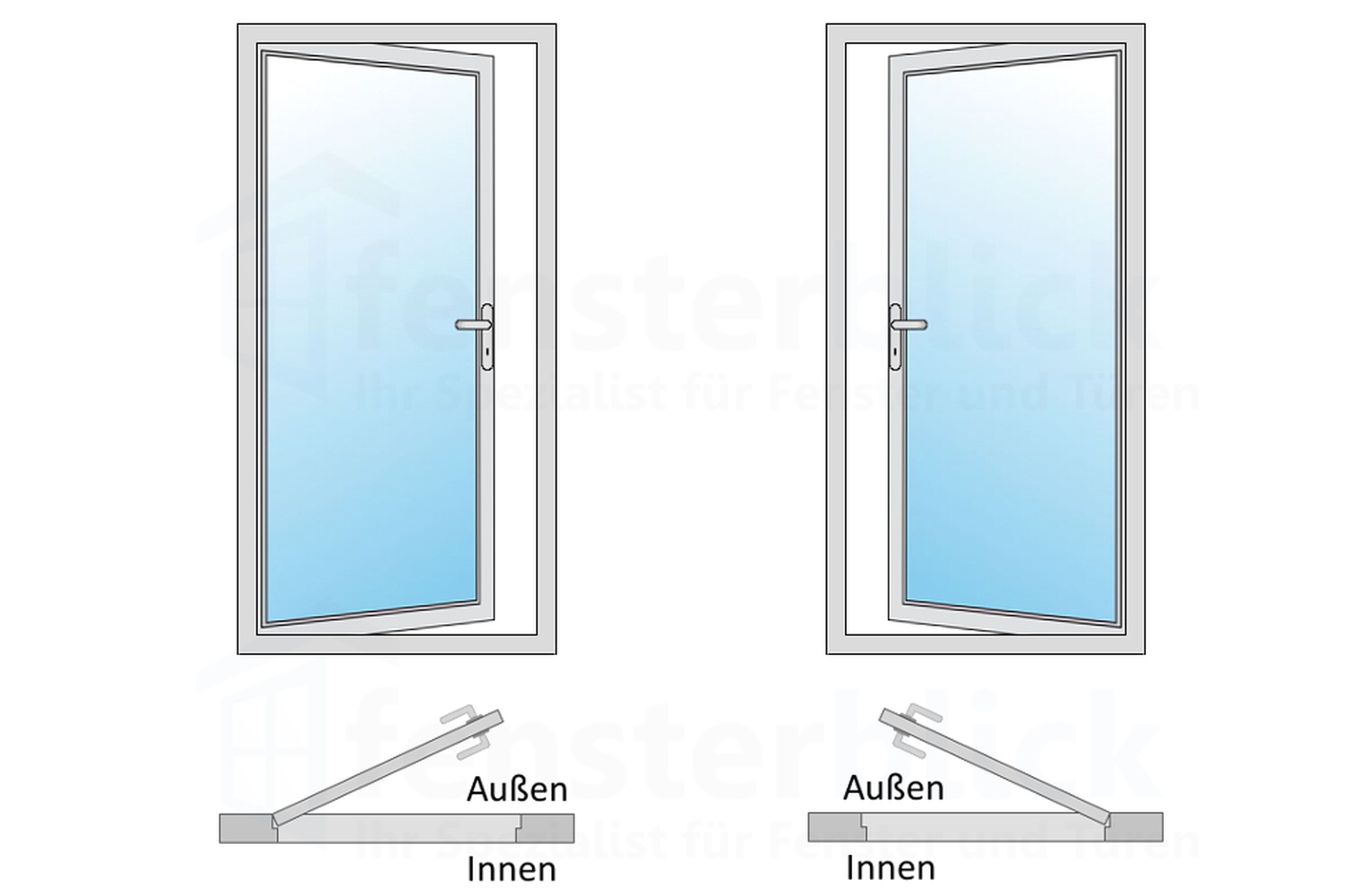 DIN rechts Öffnung - Die Türbänder sind auf der rechten Seite montiert, der Türgriff & der Anschlag liegen auf der linken Seite, wenn man den Türflügel zu sich heranzieht