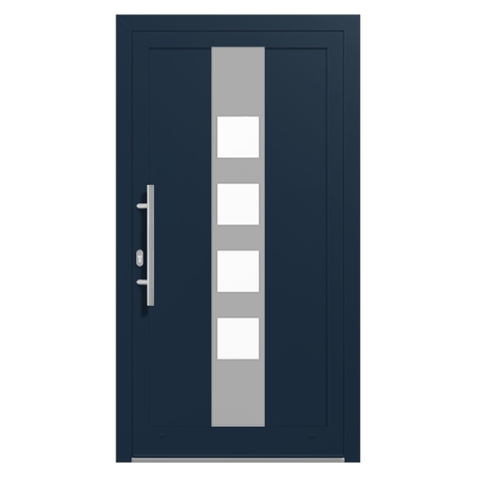 Haustüren in Stahlblau RAL-5011 sind in einem dunklen Blauton erhältlich und haben einen charakteristischen grauen Unterton. Das kühle und dunkle Blau wirkt zeitlos und modern. Es kann spielend leicht in moderne Baukomplexe mit einfachen Farben integriert werden. Als Aluminium-Haustür mit modernen Edelstahlapplikationen und einer Ornamentverglasung sowie einem Stoßgriff wirkt es besonders modern. In unserer Haustür Kategorie finden Sie vielfältige Modelle und können im Online Haustür Konfigurator alles bedarfsgerecht auf Wunsch anpassen. Vom Design bis hin zu den Verriegelungen können Sie alles gemütlich von zu Hause aus zusammenstellen und sich ein Angebot einholen!