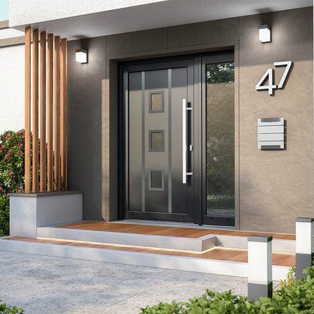 Moderne aluminium voordeuren gelden als echte eyecatchers. De metallic uitstraling en opvallende RAL-kleuren trekken direct de aandacht naar het middelpunt van de woning. Het design wordt vooral gekenmerkt door strakke lijnen en het gebruik van metalen applicaties die asymmetrisch over het deurpaneel lopen. Glasinzetten worden hierbij bewust eenvoudig gehouden, bijvoorbeeld in één opvallende vorm of in een verticale reeks met moderne accenten.